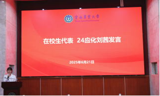 24应化刘茜作为在校生代表发言。她向即将毕业的学长学姐们送上最美好的祝福,同时表示会以他们为榜样,努力学习,不断提升自己。