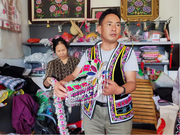 图为省级彝绣技艺传承人向实践队员展示彝绣作品。