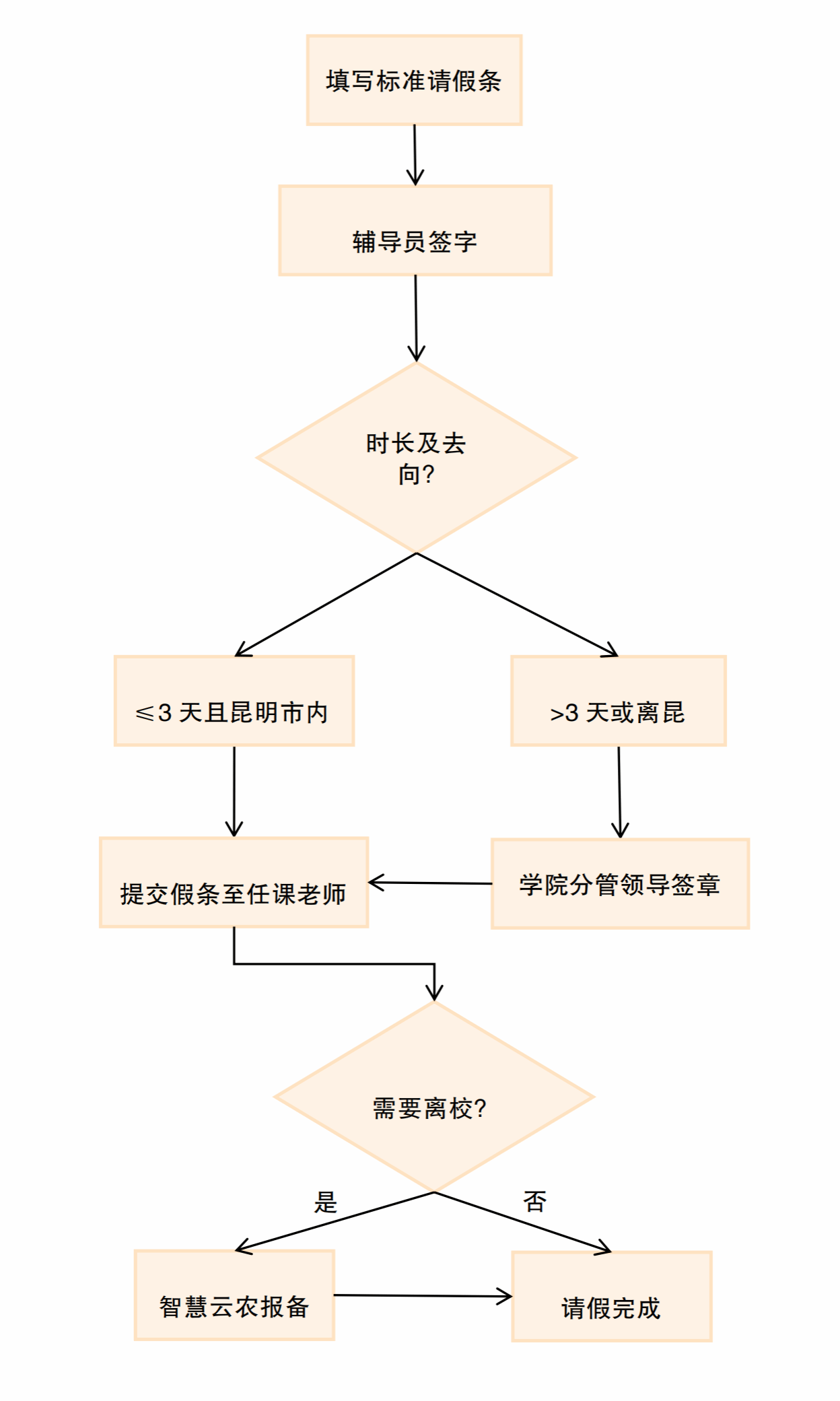 家在昆明市需周末(节假日)回家居住或因其他原因当日不返校的在昆外出学生,实行网络报备—辅导员(班主任)审核制度,须通过“智慧云农平台”提交申请,明确行程及事由,再提交辅导员(班主任)审批。如需请假离开昆明市的外出学生,实行网络请销假制度,提前与辅导员(班主任)说明情况,且学生家长需知情同意,再通过“智慧云农平台”提交申请,明确行程及事由,提交辅导员及学院两级审批。