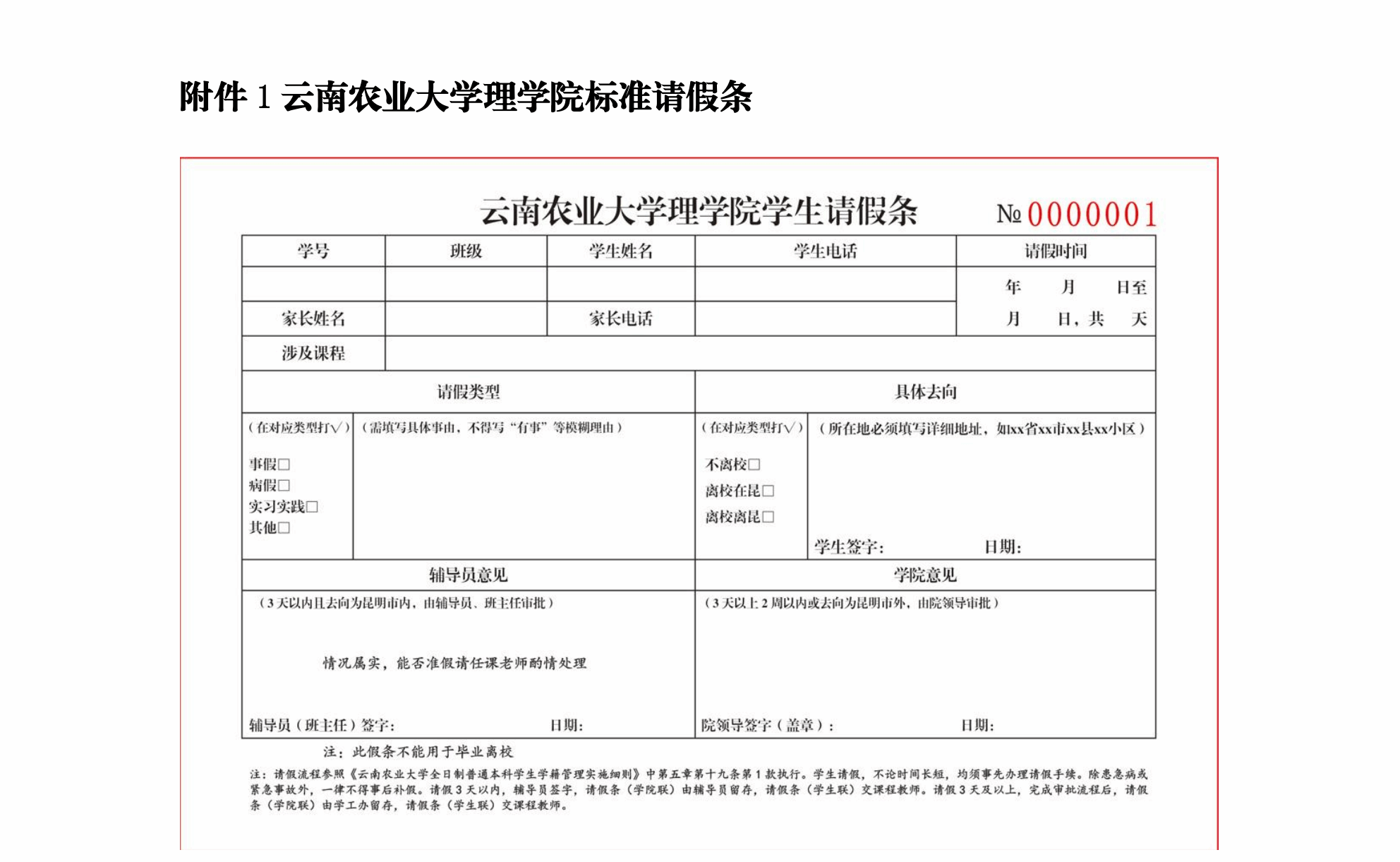 学生课程请假,不论时间长短,均须事先办理请假手续。需要请假的学生事前找辅导员(班主任)获取纸质标准版请假条。除患急病或紧急事故外,一律不得事后补假。因病请假3天以上(含3天)的须有医生证明,因事、因公请假须提供必要的证明。请假批准权限:3天以内且去向为昆明市内由辅导员(班主任)批准;3天以上两周以内或离开昆明市,辅导员(班主任)签署意见后由学院审批;2周以上至1个月内由辅导员(班主任)签署意见,经学院审核后报教务处审批;在校外实习的学生请假由指导教师批准,回校后按请假批准权限补办请假手续。